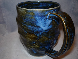 I do still like doing the other carving style and have discovered a use for some horrible dark gray glaze that I've purchased. No matter how much I hate a glaze, I can't seem to throw it out until I've actually used it up. And I tend to buy glazes a lot to try them out so I have a ton of glazes in my cupboard that I don't like. But anyway, I found that if I put the gray glaze on mugs with this carving style and then clean it off, I sits in the grooves. Then this clear blue glaze goes over it and you get a kind of tiki effect. Yay finding uses for crappy stuff!